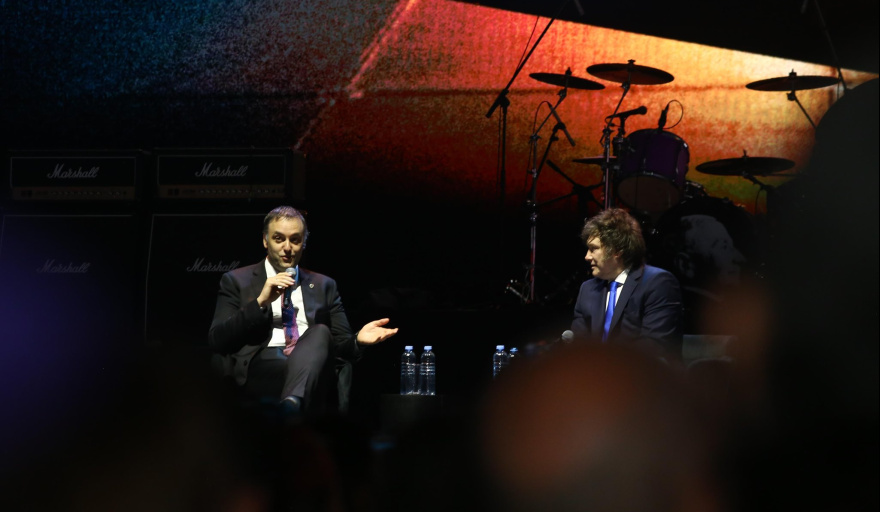 "Milei eructó bastante al cantar canciones ante sus seguidores sobre el escenario del Movistar Arena." |