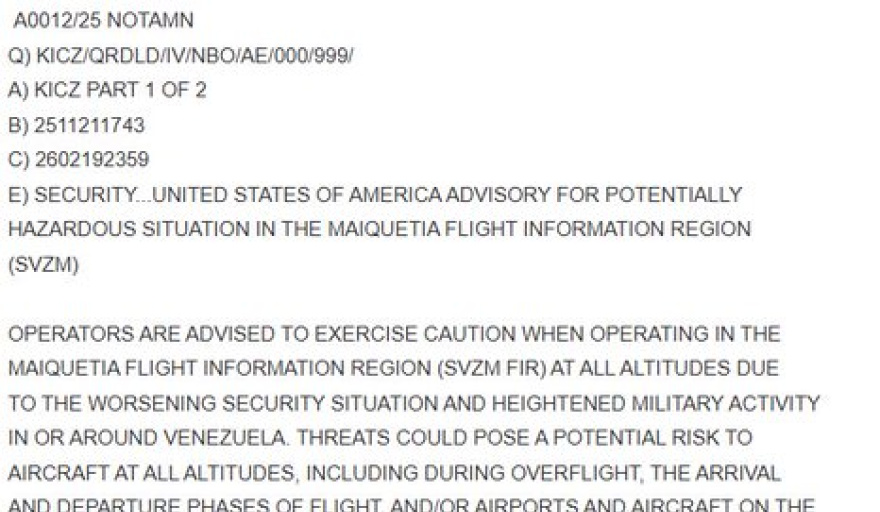 El anuncio, difundido en el sitio oficial de la FAA y rastreadores como Flightradar24, coincide con el despliegue naval estadounidense en el Caribe –incluyendo el portaaviones USS Gerald R. Ford– y ejercicios militares venezolanos desde septiembre. ¿Es una mera precaución o un preludio a una confrontación mayor bajo la administración Trump? Analistas lo ven como un "aviso diplomático" en un contexto de sanciones renovadas y retórica beligerante de Caracas contra Washington.Detalles del NOTAM: Riesgos Específicos y Alcance GeográficoEl SVZM, con sede en el Aeropuerto Internacional de Maiquetía (SIMC, cerca de Caracas), es una de las FIR más extensas de América Latina: abarca todo Venezuela, las islas ABC (Aruba, Bonaire, Curazao), partes de Colombia, Guyana y Trinidad y Tobago, y aguas del sur del Caribe hasta los 12° de latitud norte. El aviso cita: